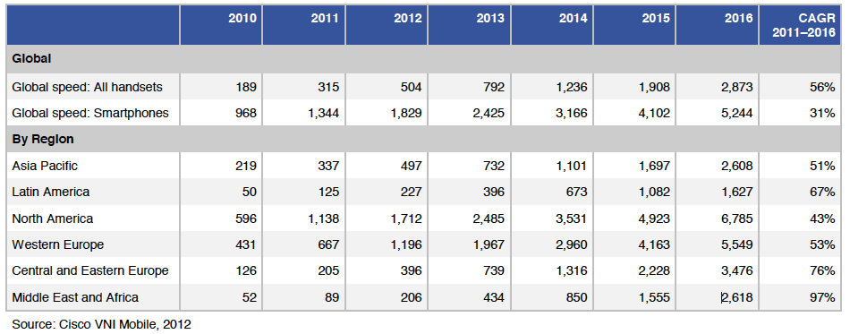 As velocidades dos Smartphones (geralmente de terceira geração e superior), são atualmente mais de quatro vezes superiores às da média global e prevê-se que quadrupliquem até 2016, atingindo um valor superior a 5.2 Mbps.
